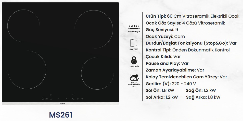 Ferre MS-261 Vitro Seramik Elekrikli 4 Gözlü Ocak